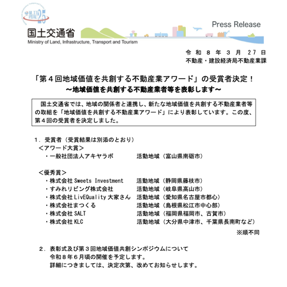 お知らせ空き家対策「アキヤラボ」が国土交通省「地域価値を共創する不動産業アワード」大賞を受賞!