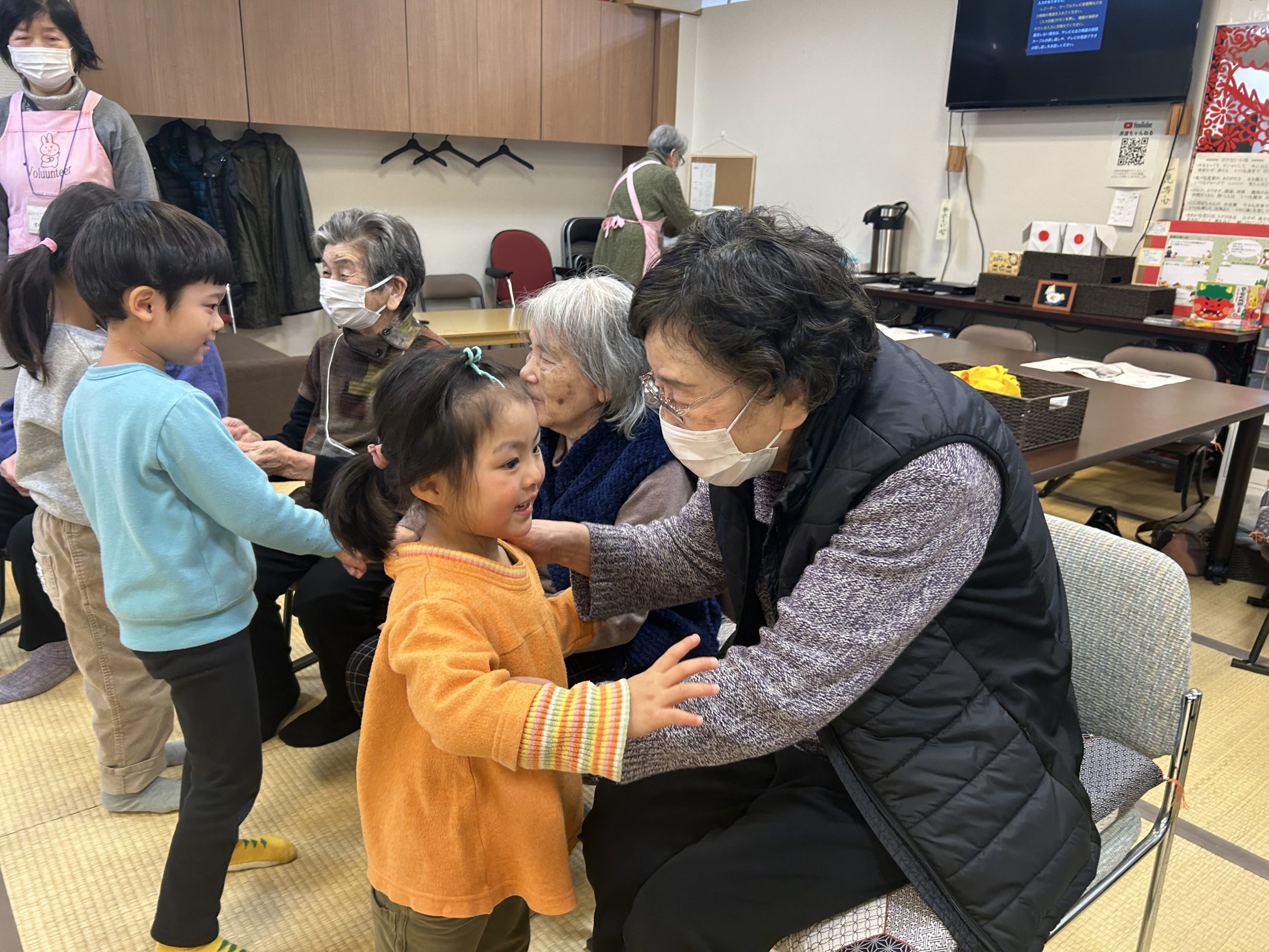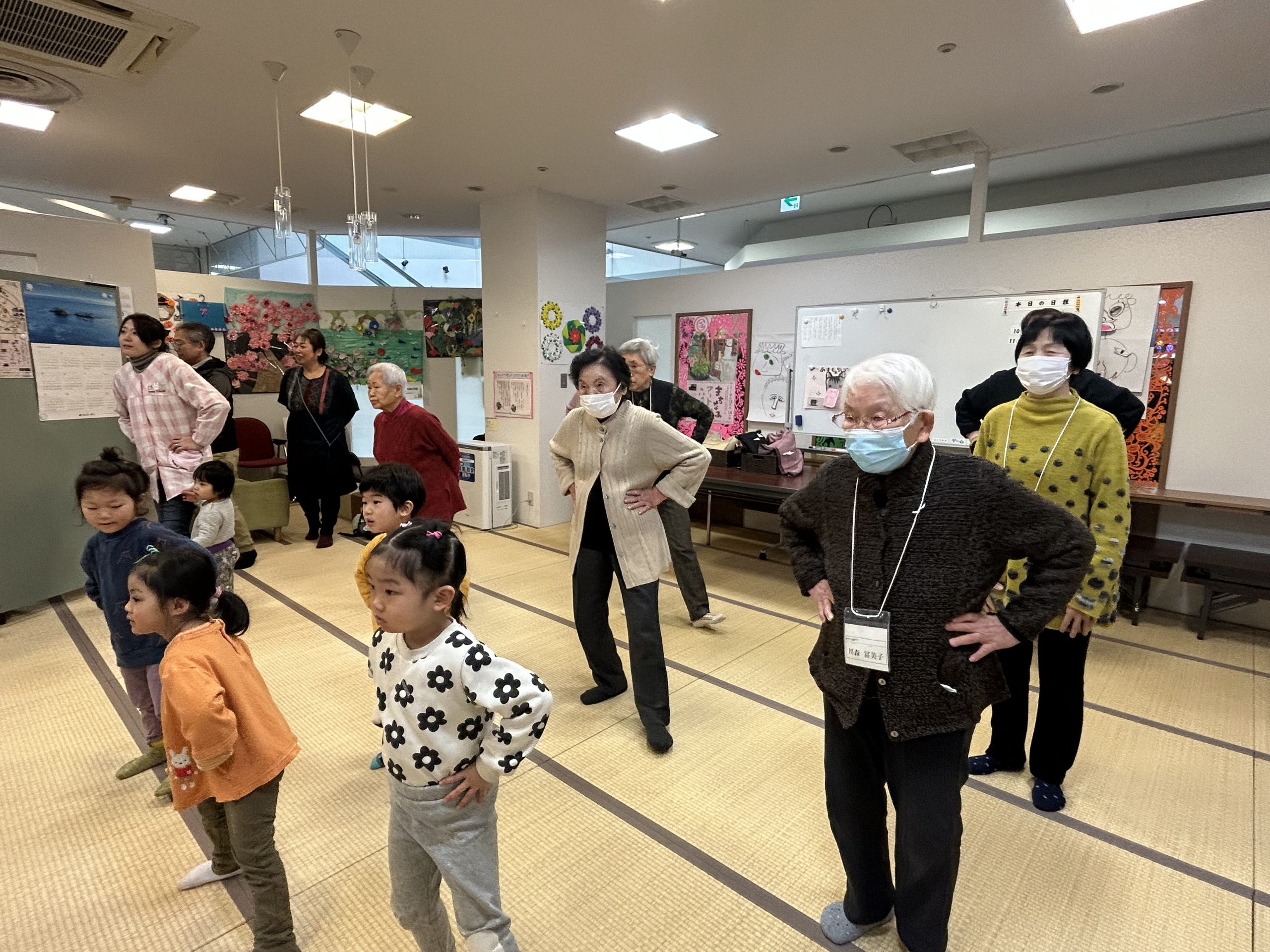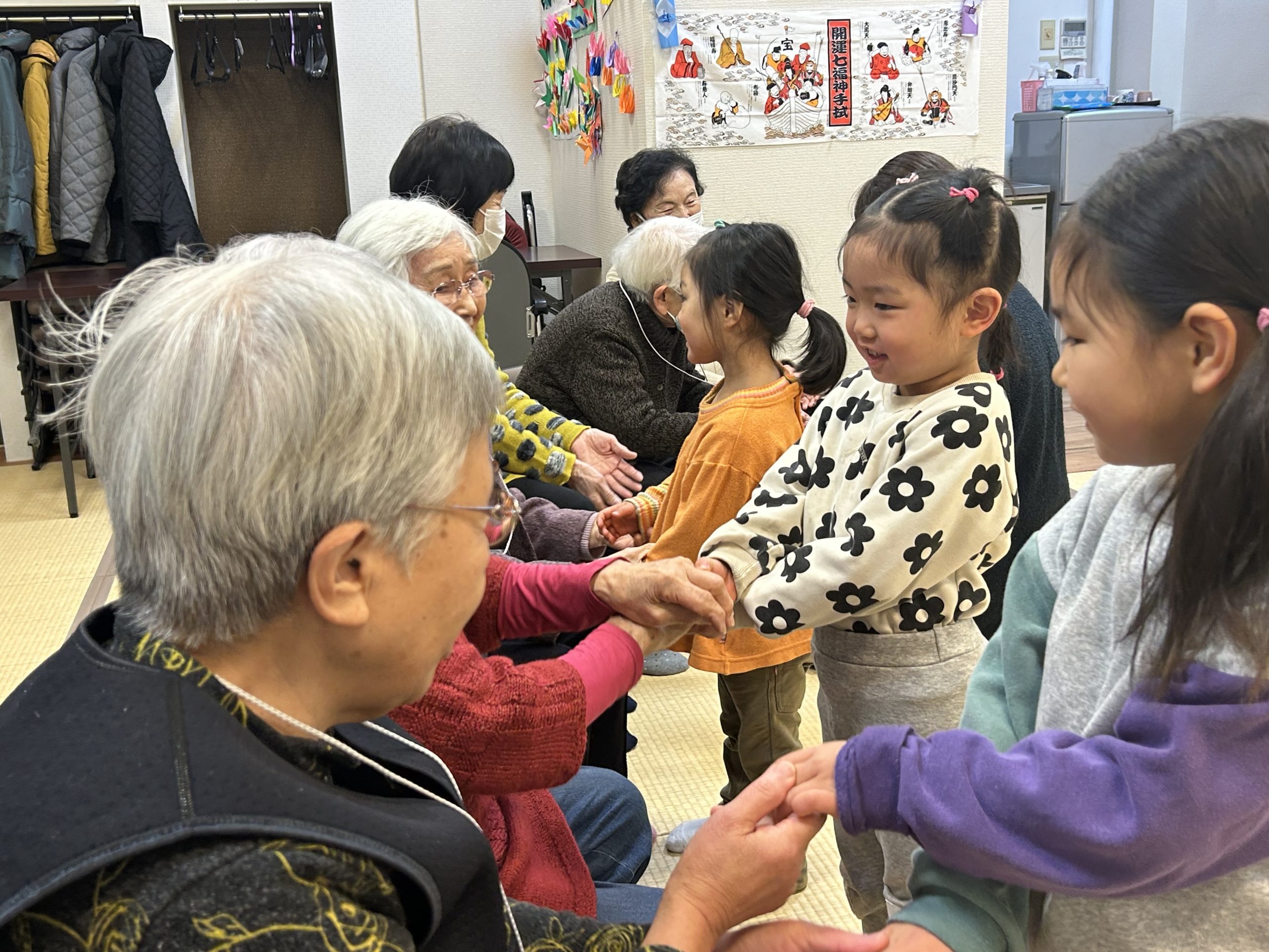 「あすも元気デイ」には、生活機能の低下を予防するために高齢者の方々が集まっておられ、毎週木曜日、年間50回にわたってに開催しています。今回は、井波地域の認可外保育施設「寺子こどもえん」の園児たちと先生が来てくださいました!