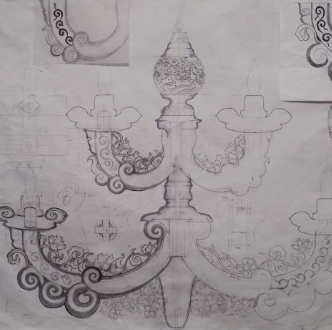 日本遺産の事業では、木彫刻のシャンデリアを制作。ラフスケッチを描き、仲間と相談して加飾や構造を決めました。社寺建築に用いられる「法相華」という唐草と架空の花を組み合わせた紋様を施すなど、井波彫刻の技術を応用。5名の木彫刻師と分担し、金属やガラスが一般的な照明のアーム部分も木製にし、木の風合いや経年変化を楽しめる作品に仕上がりました。和室に欄間を飾る文化が途絶えつつあるなか、井波彫刻の欄間に代わる新たな工芸品として国内外にPRしたいと思います。