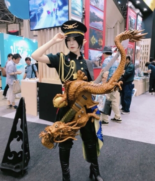 日本遺産チームで出展した「ツーリズムエキスポ2018」では、井波彫刻の施されたギターを携えてオリジナルコスプレを披露し、来場者に井波の日本遺産事業をPRしました。井波彫刻のギターは何度もテレビ番組で紹介されていて知名度があり、熱心に装飾を眺める方も多く、コスプレと相まってインパクトのある展示になったのではと思います。スマホやSNSの時代に、人とコラボできるような井波彫刻の作品が増えていくと、もっと面白い展開が生まれるかもしれませんね。